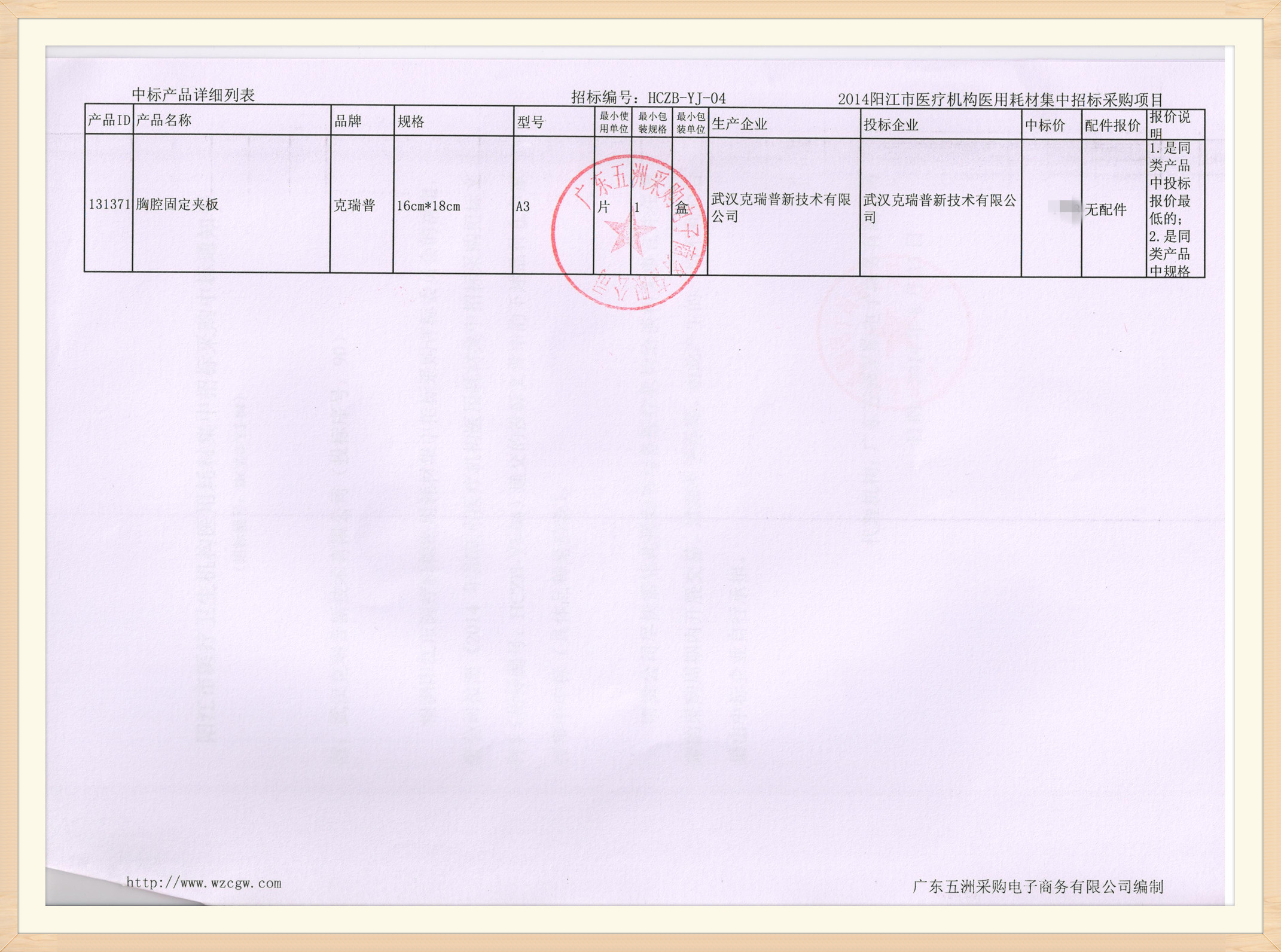 【廣東省2014陽(yáng)江市醫(yī)療機(jī)構(gòu)醫(yī)用耗材集中招標(biāo)采購(gòu)項(xiàng)目】東科圣康品牌胸腔固定夾板在2014年陽(yáng)江市醫(yī)用耗材招標(biāo)采購(gòu)項(xiàng)目中我們這款產(chǎn)品已成功中標(biāo),東科圣康胸腔固定夾板是一款由高分子納米材料、記憶鋁合金板、多頭肋骨固定帶組成,具有結(jié)構(gòu)好,重量輕體驗(yàn)度好,無(wú)需加熱,操作簡(jiǎn)單方便等特點(diǎn)??捎糜诠强?、胸外科、急診科等科室的胸背部閉合性、開放性肋骨骨折的固定復(fù)位等,可良好的運(yùn)用以及使用。