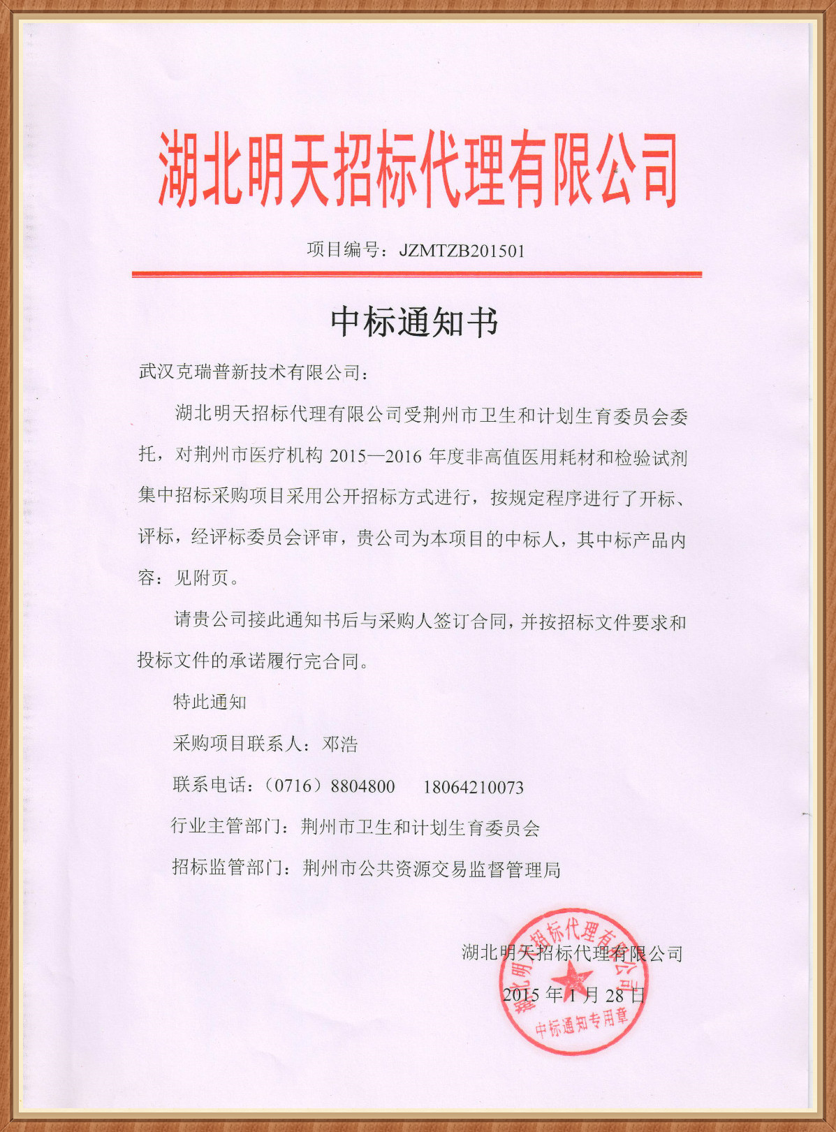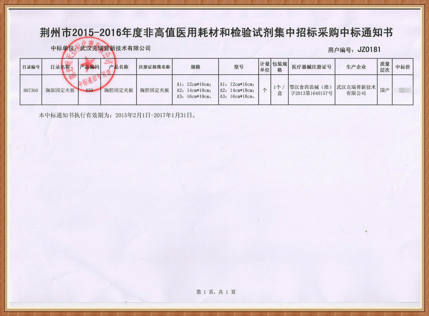 【湖北省荊州市2015-2016年度非高值醫(yī)用耗材和檢驗試劑集中招標(biāo)采購中標(biāo)通知書】武漢克瑞普新技術(shù)有限公司在荊州市醫(yī)療機構(gòu)非高值醫(yī)用耗材和檢驗試劑集中招標(biāo)采購項目中我司經(jīng)評標(biāo)委員會的評審決定成功獲得了中標(biāo)的資格,我們本次中標(biāo)的產(chǎn)品是我廠家較為關(guān)注的一款產(chǎn)品那就是我們的東科圣康品牌的胸腔固定夾板產(chǎn)品,這款產(chǎn)品在醫(yī)院以臨床使用中較為良好,我們歡迎各大經(jīng)銷商與我們?nèi)〉煤献鳌?/span>
